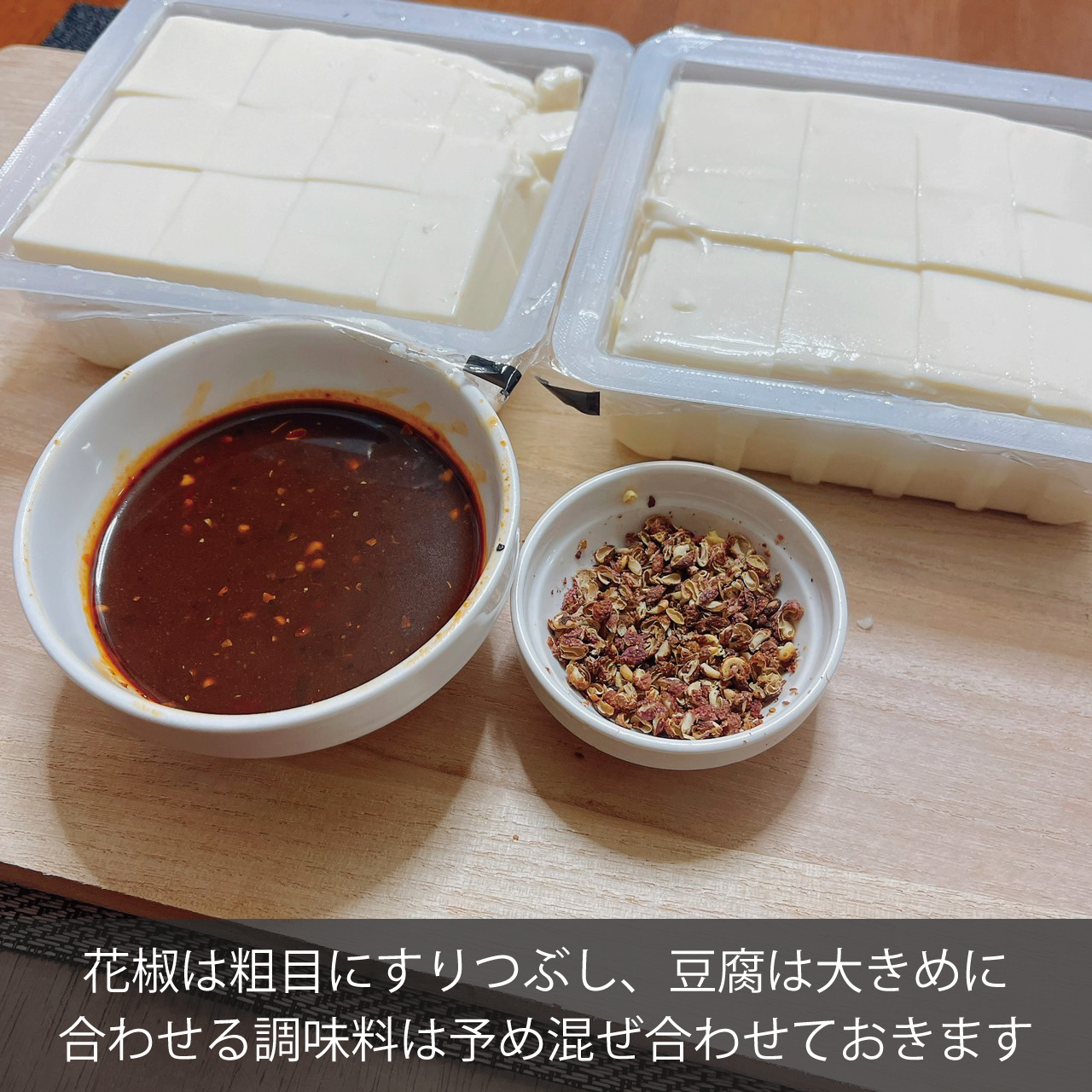 ③花椒をすり鉢で粗目にすりつぶす。豆鼓を粗目に包丁で刻んで酒大さじ1でふやかして、醤油大さじ1.5、塩胡椒適量、砂糖小さじ1/3、甜麺醤大さじ1/2を混ぜ合わせ、合わせ調味料の完成。