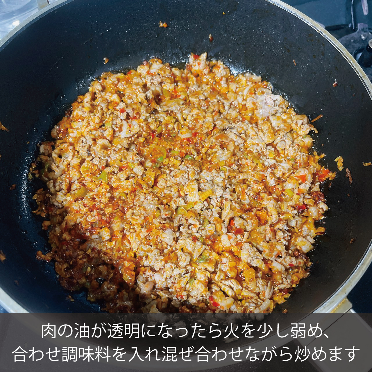 ひき肉をフライパンに入れたらあまり触らず放置。いじらない事でひき肉が塊になり逆にこれがメイラード反応を引き起こし香ばしく、ゴツゴツと肉感の強い麻婆餡ができます。面倒ですが、切り落とし肉などを荒く切ってひき肉代わりに使うとさらに肉感が増します。