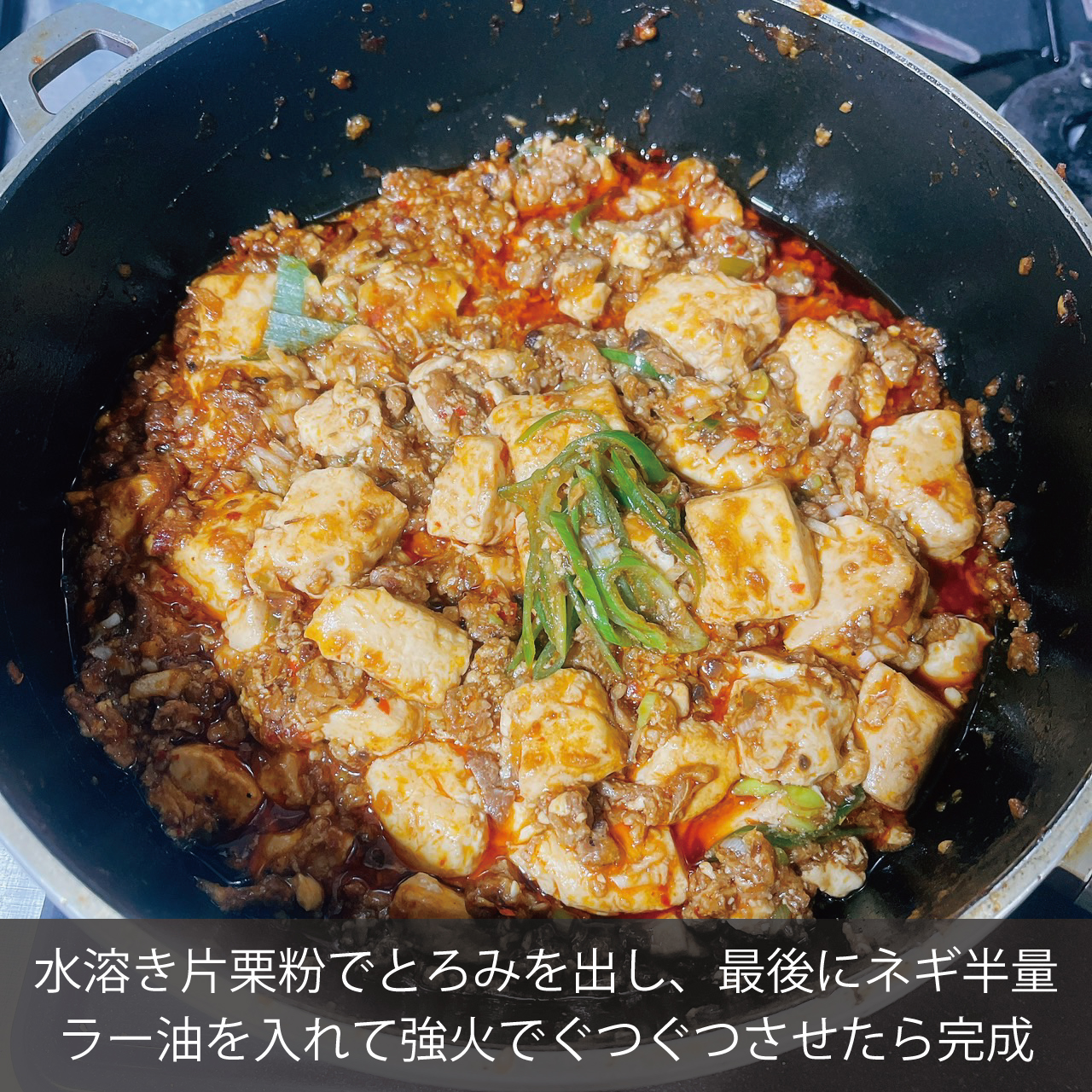 ⑦豆腐を入れ、弱火から中火で焦げないように4分程グツグツと煮込む。豆腐から水分が出て温まったら、火を消すか、火からフライパンを外して水溶き片栗粉を2.3回に分けてとろみをつける。