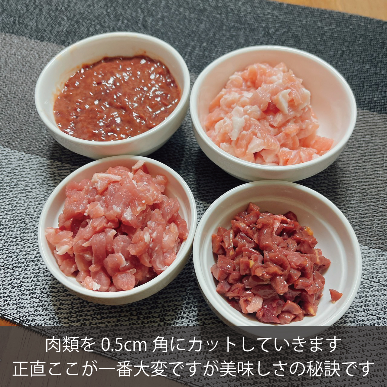①豚肩ロース肉、豚トロ、を0.5cm角程度にカットする。鶏レバーは太い血管を取り除き、ハツは白い余分な脂を取り除く。