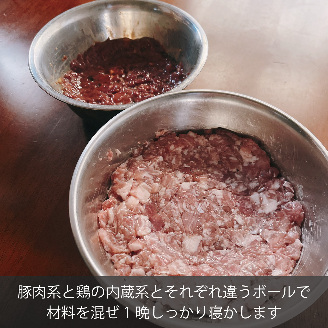 ①肉のタネは調味料をあわせてしっかり1晩寝かせる