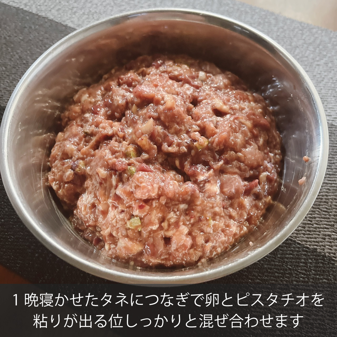 ⑤1晩寝かせた②③を粘りでる位しっかりと混ぜ合わせた後つなぎ用の卵1個、ピスタチを混ぜ合わせます。