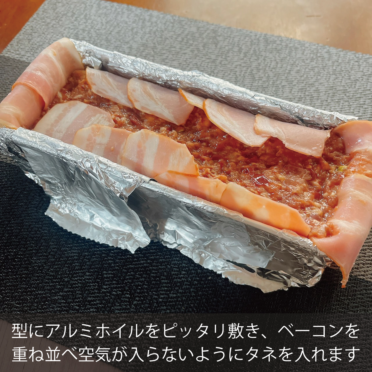 ⑥パウンドケーキ型にアルミホイルをピッタリと引き、ベーコンを重ねながら敷き詰め、タネを空気が入らないように数回に分けて入れます。