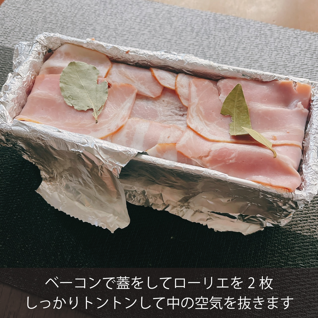 ⑦ベーコンで包むように蓋をして、パウンドケーキ型をまな板等の上にトントン落として空気を抜きます。ローリエ2枚をベーコンの上に入れアルミホイルでしっかり蓋をします。