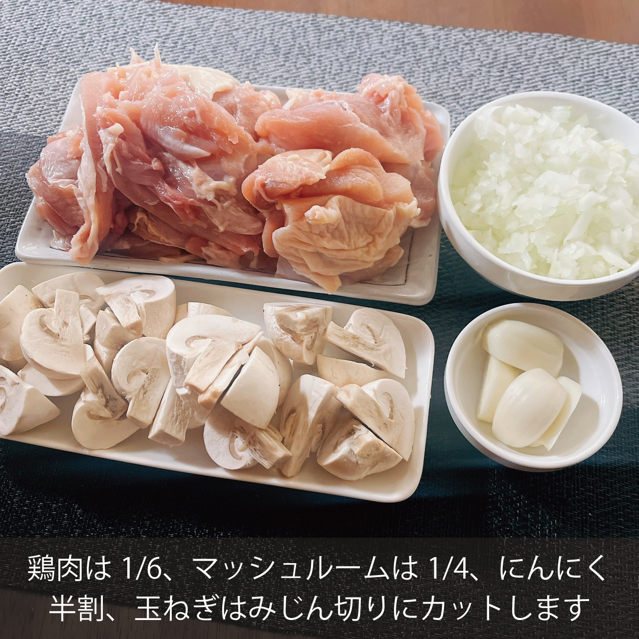 ①玉ねぎ1/4をみじん切りにします。マッシュルームは汚れをキッチンペーパ等で拭き取り1/4位の大きさにカットする。にんにくは半割にする