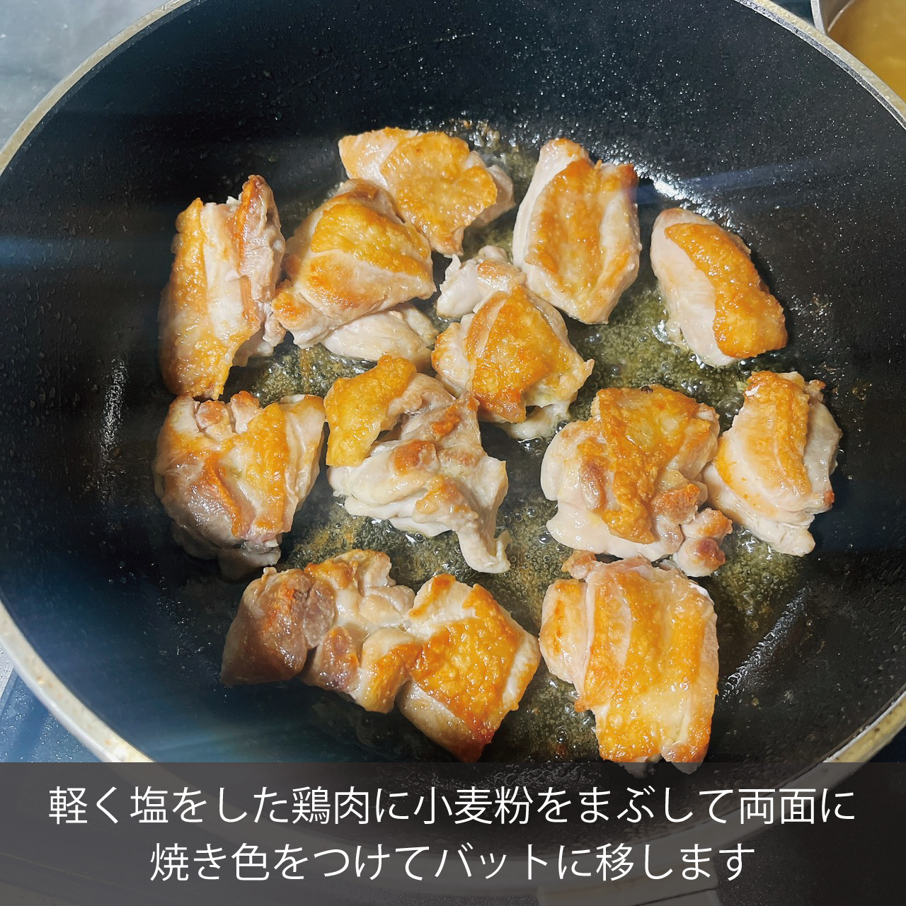 ①鶏肉は小麦粉をまぶし皮目をしっかりと焼く