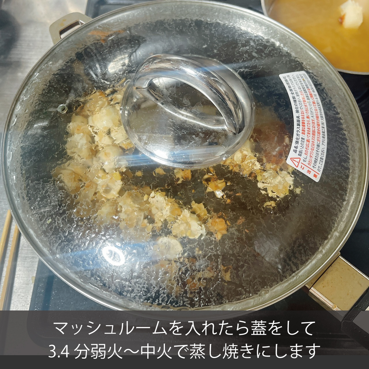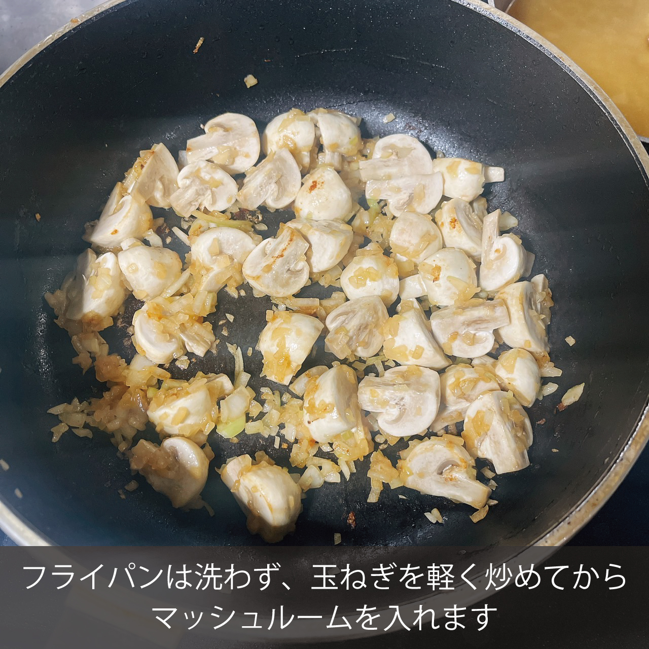 ⑤フライパンは洗わずに、中火で玉ねぎ1/4を軽く炒め(オイルが足らなければ足してください。)マッシュルームを入れて蓋をし、弱火~中火で蒸し焼きにします(3.4分)