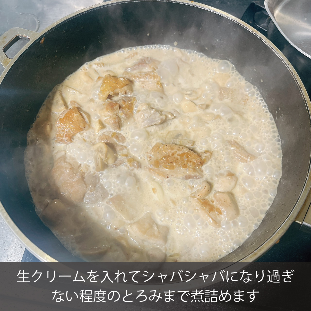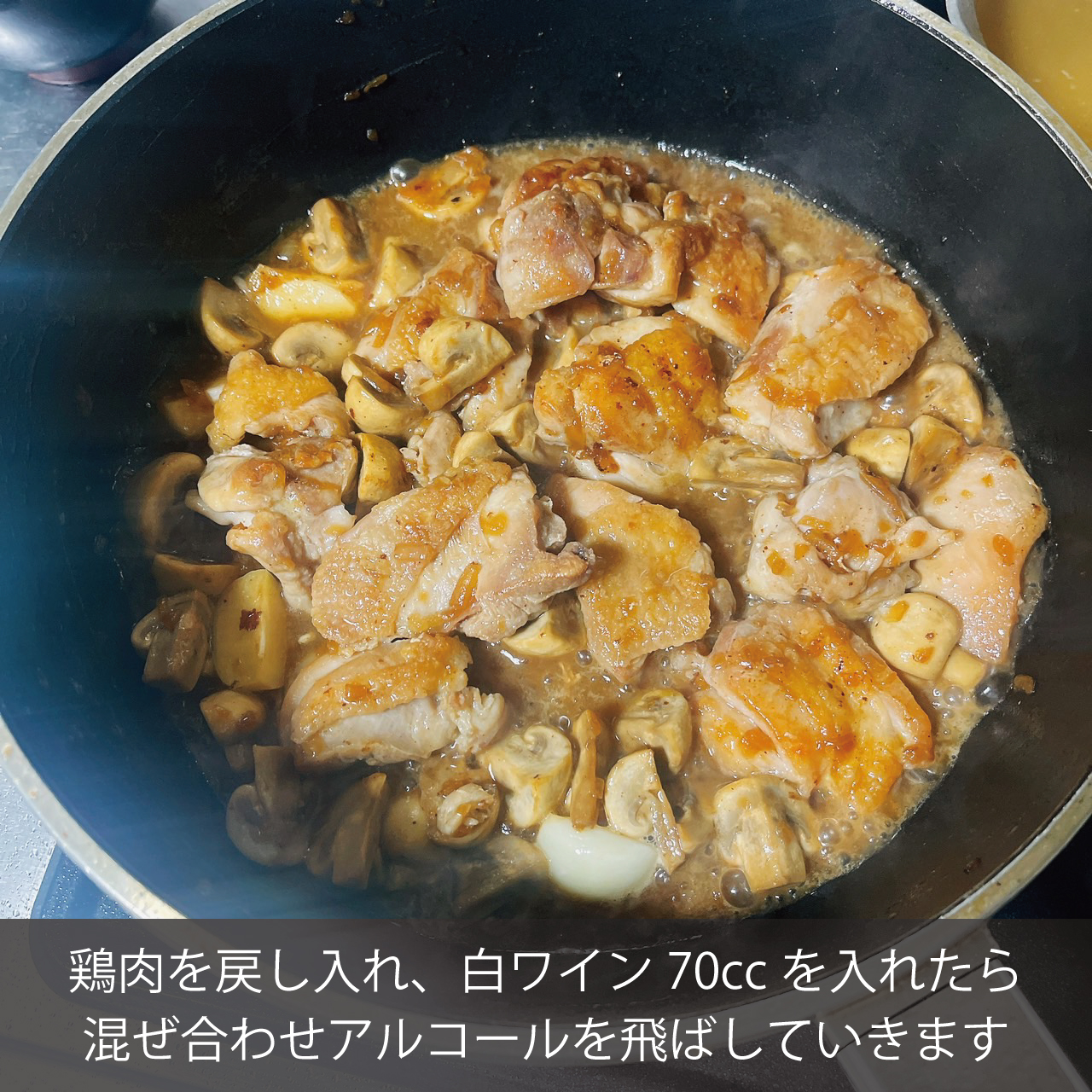 ⑥鶏肉を戻し入れ混ぜ合わせ、白ワイン70ccを入れて全体に絡めながらアルコールを飛ばします。チキンブイヨン180cc、生クリーム50cc入れて軽く煮詰めます。しゃばしゃばではなく、少しとろっとするまで煮詰めます。