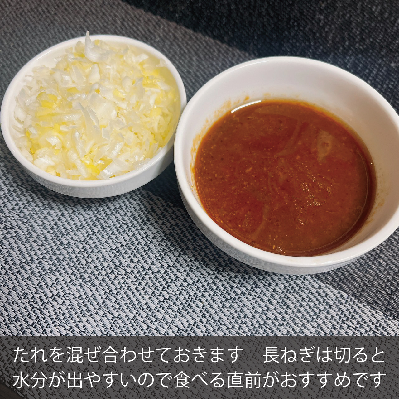 ③たれを作ります。にんにくすりおろし小さじ1/2、生姜すりおろし小さじ1/2、醤油大さじ1、酢大さじ1、オイスターソース小さじ1、味噌小さじ1、砂糖小さじ1、ごま油小さじ1、ナンプラー小さじ1を混ぜ合わせ、長ねぎのみじん切りは食べる直前にカットし混ぜます