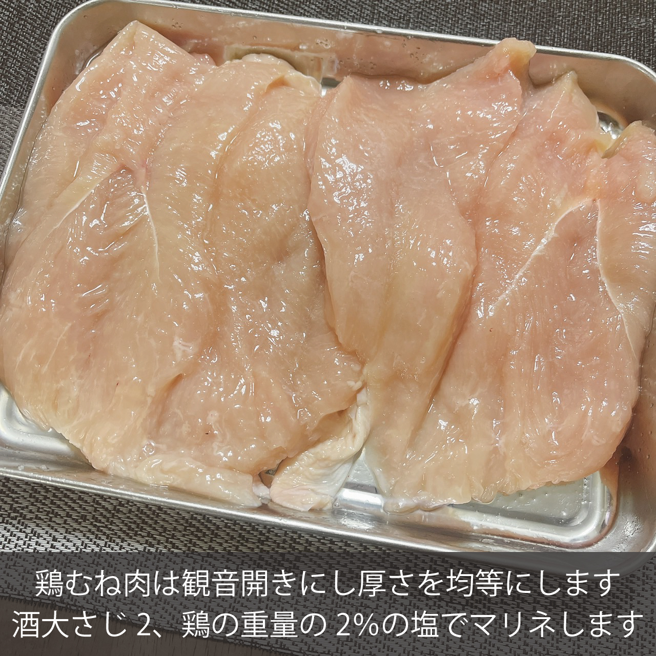 酒大さじ2をふりかけ鶏肉の重量の2%の塩を揉み込みジップロック等に入れ脱気して1時間程馴染ませます。