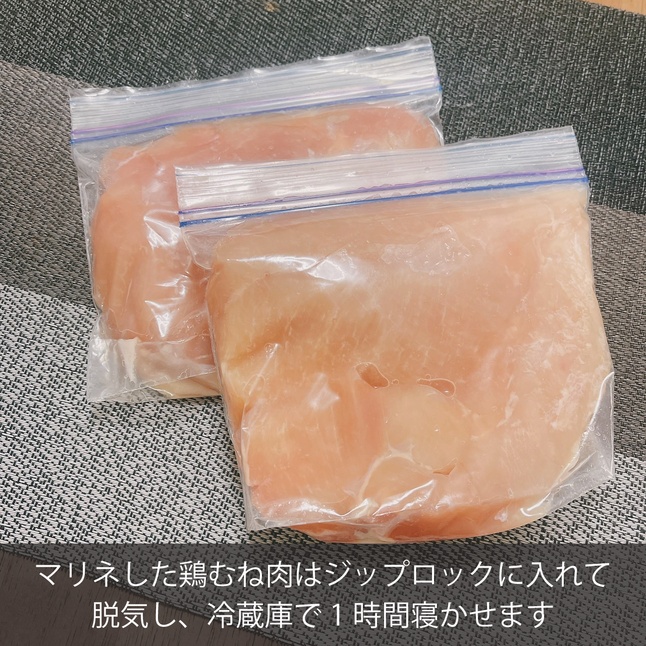鶏むね肉は酒と塩でマリネして寝かせますが、2%と塩が強めなので1時間たったら低温調理を開始してください。