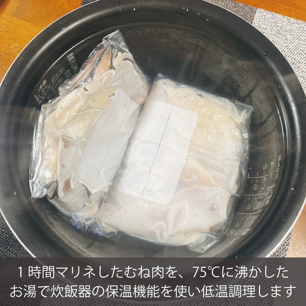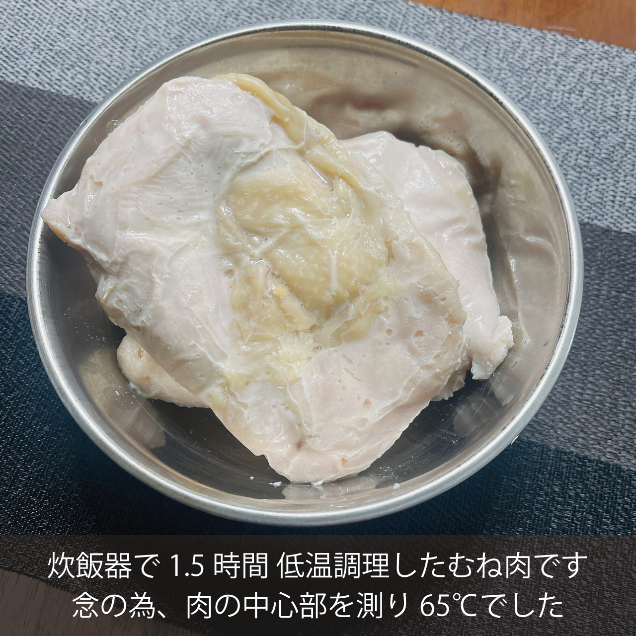 以前は鶏もも肉を使ったレシピだったんですが、今回はヘルシーで安い鶏むね肉を使い、炊飯器で低温調理します。