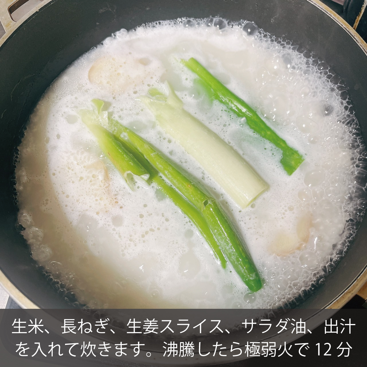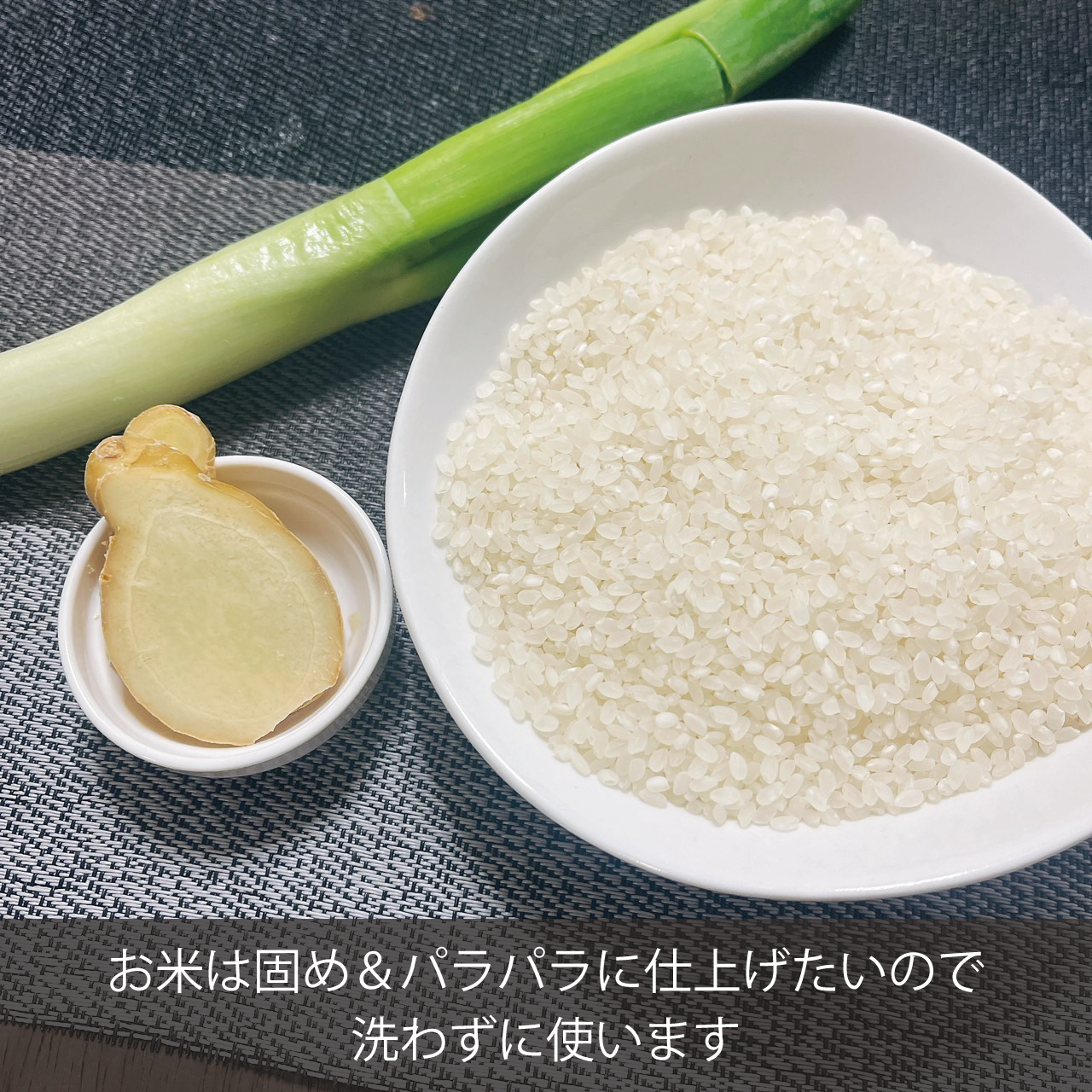 ④洗っていない生米に②のジップロックの中の茹で汁と水をあわせて300g、酒大さじ1、サラダ油5g、長ねぎの青い部分1本分、生姜スライス3枚を鍋に入れて炊きます。沸騰するまでは中火で、沸騰したら極弱火で12分 硬さは食べてみて調節してください。