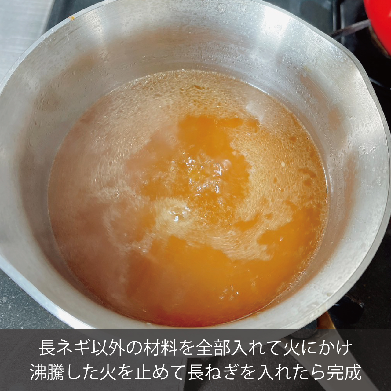 ②長ねぎ以外の材料を鍋に全て入れて沸騰させます。沸騰したら火を止めネギを入れて完成です。