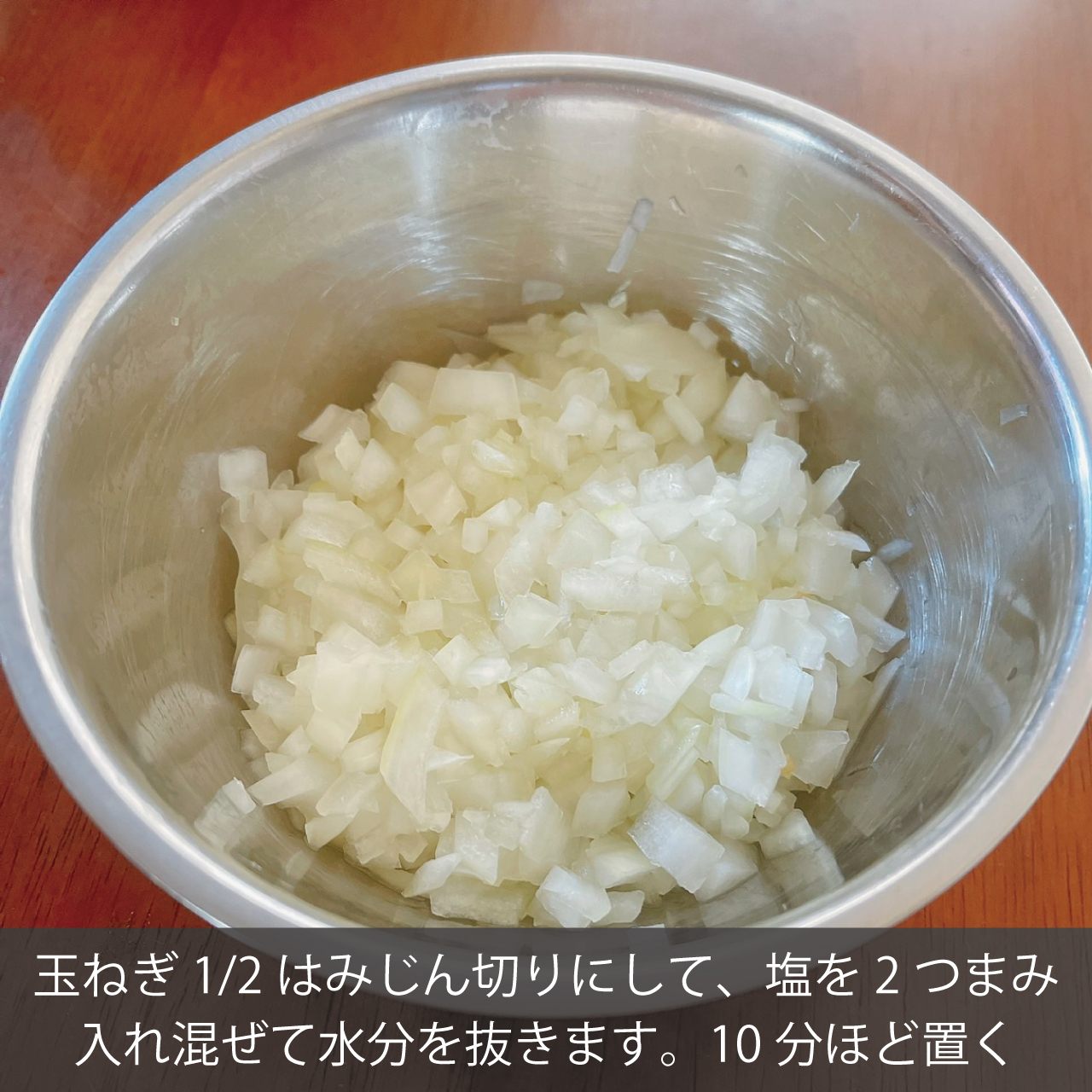 ①玉ねぎ1/2をみじん切りにして、塩2つまみを混ぜ合わせ10分常温でおきます。10分経ったらぎゅぎゅっとしっかり玉ねぎを絞り、水気を抜きます。