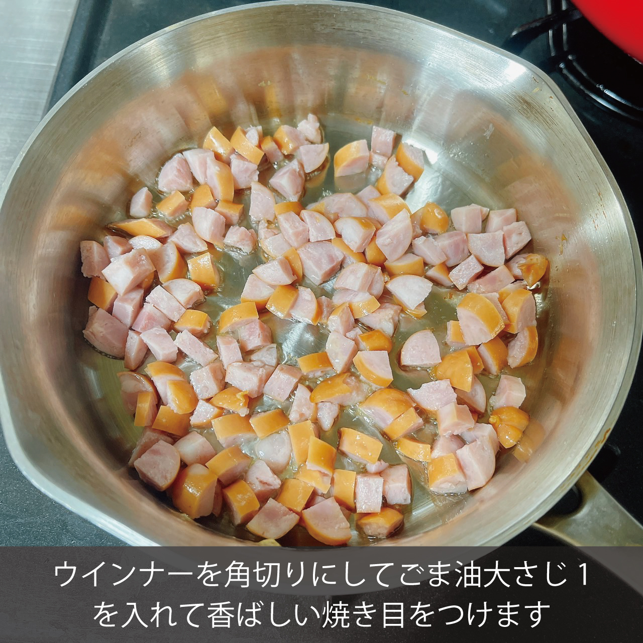 ②ソーセージを角切りにしてカリカリに焼く