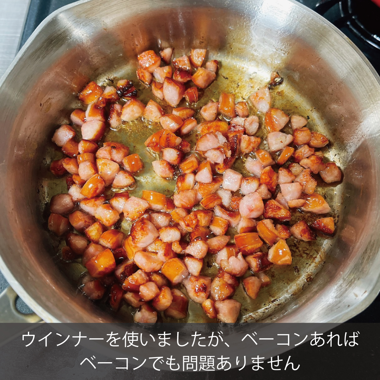 香ばしさを出す為にソーセージをカリカリに焼いて香ばしさをだします。通常ならベーコンの出番ですがソーセージの方が家にある方が多いんじゃないかと思い今回はウインナー使いました。ちなみにシャウエッセンです。