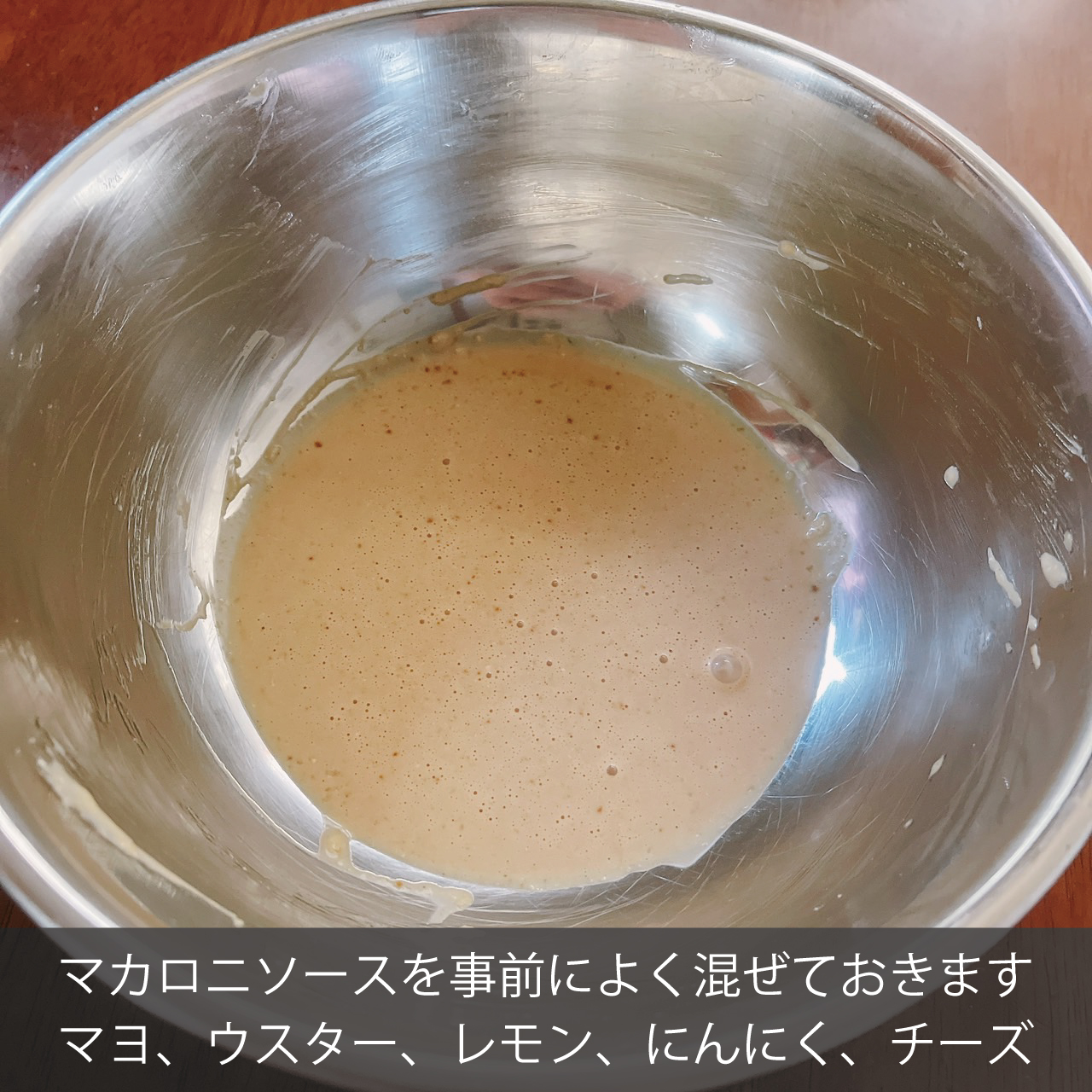 ③ソース作り マヨネーズ大さじ3、ウスターソース小さじ2、レモン果汁小さじ1.5、おろしにんにく小さじ1、パルメザンチーズ15gをよく混ぜ合わせておきます。