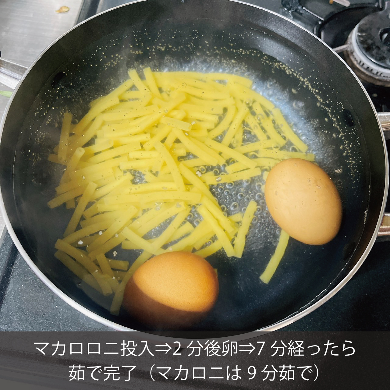 ⑥マカロニと卵を茹でます フライパンに水を入れて沸騰させ、塩小さじ1入れます。沸騰したお湯にマカロニを入れて(茹で時間9分)2分後、卵を入れ7分経ったら引き上げます。