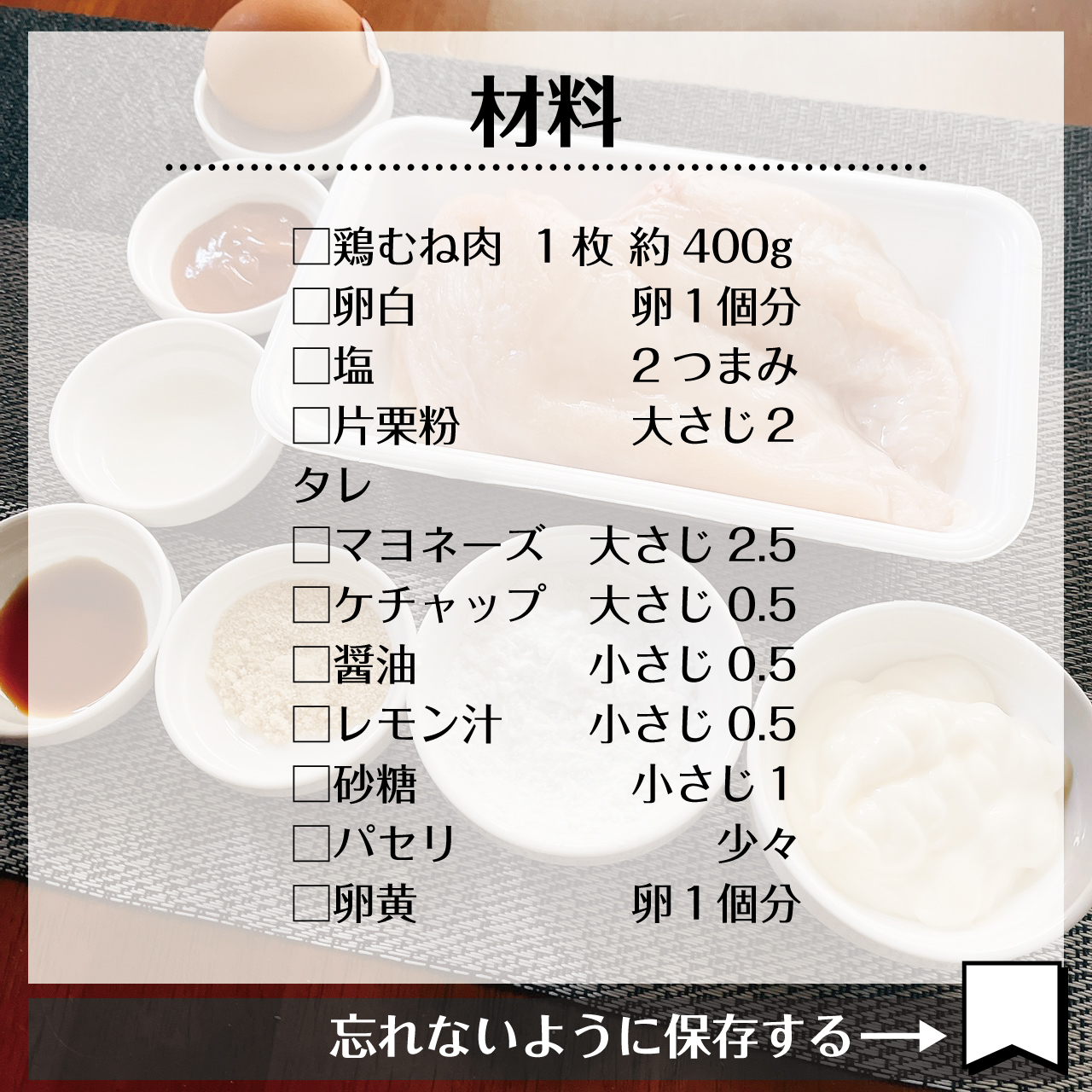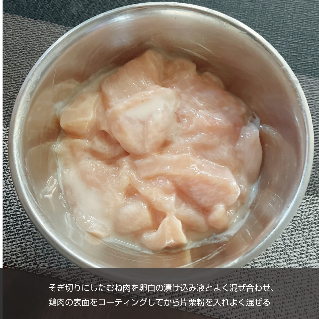 鶏肉の表面が卵白でコーティングされ鶏肉の中の水分が出にくくなる。