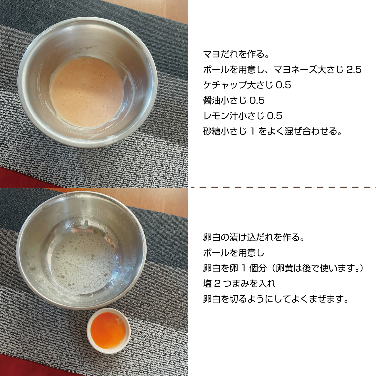 ②マヨだれを作る。ボールを用意し、マヨネーズ大さじ2.5、ケチャップ大さじ0.5、醤油小さじ0.5、レモン汁小さじ0.5、砂糖小さじ1をよく混ぜ合わせる。