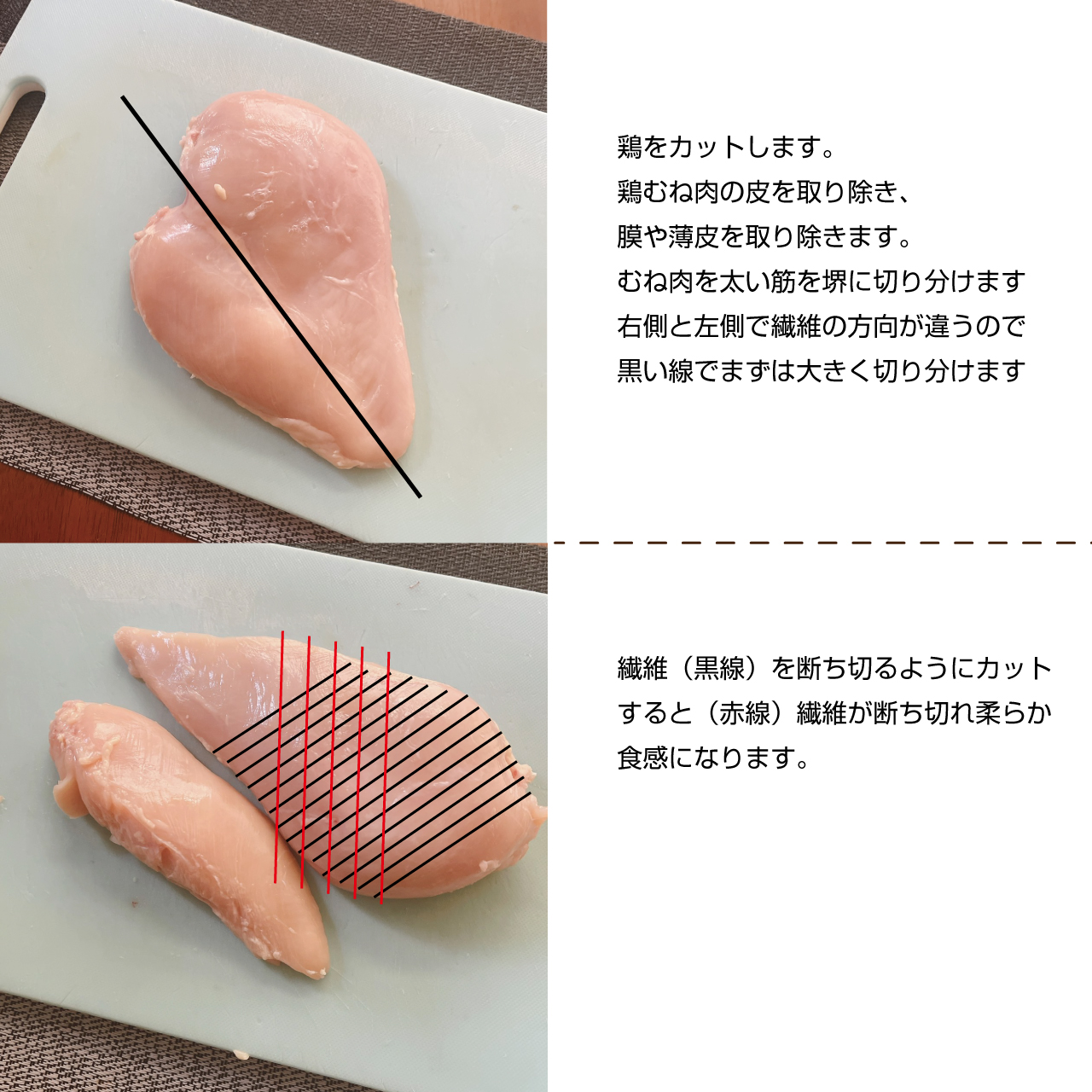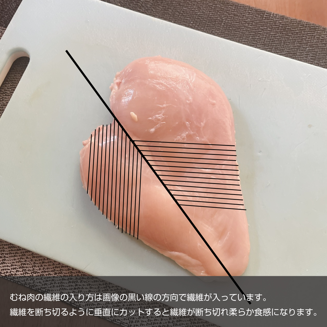 ①むね肉を切る際は繊維を断ち切るようにそぎ切りに