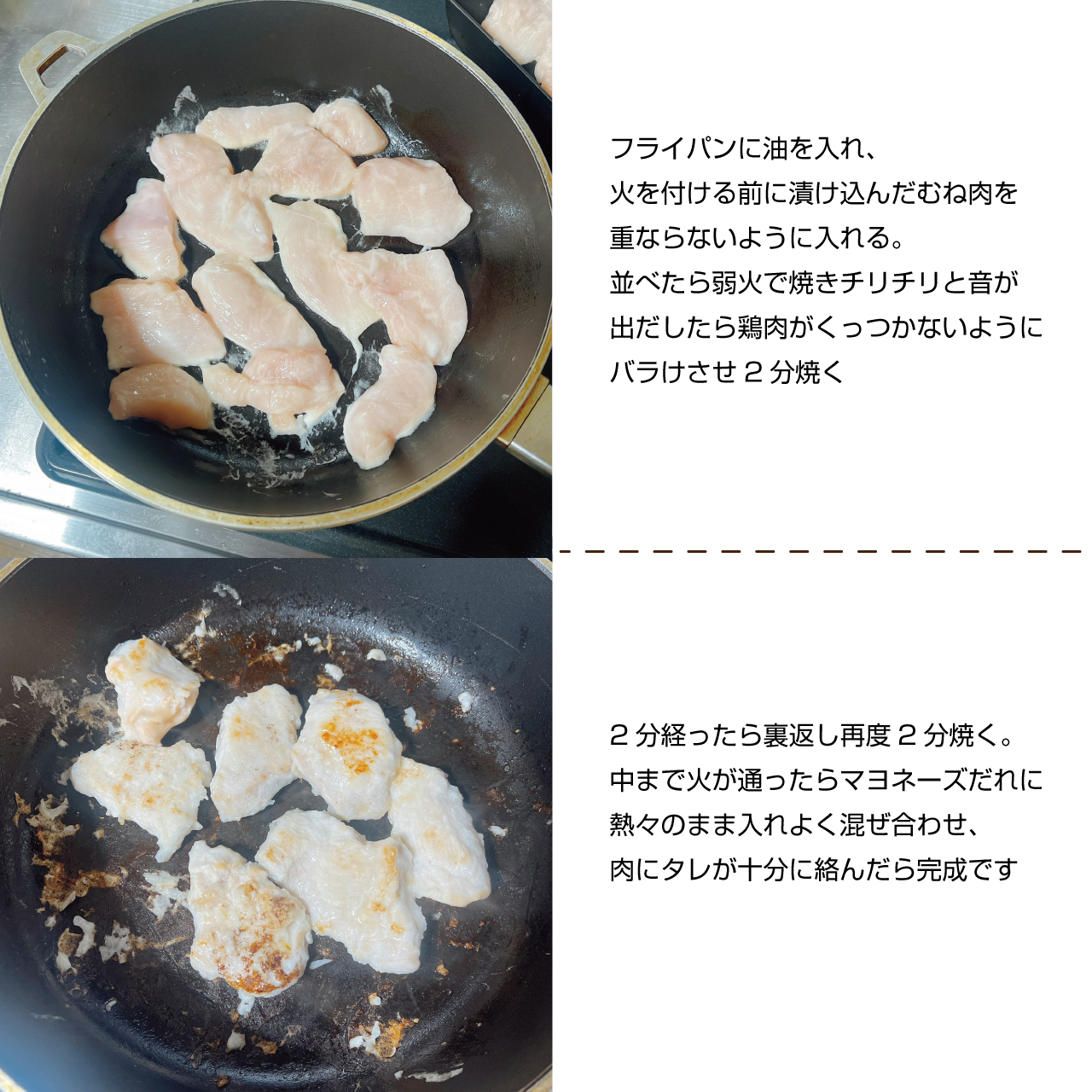 ⑦2分経ったら裏返し再度2分焼く。2分経ったら②のマヨネーズだれに熱々のまま入れよく混ぜ合わせ、肉にタレが十分に絡んだら完成です。