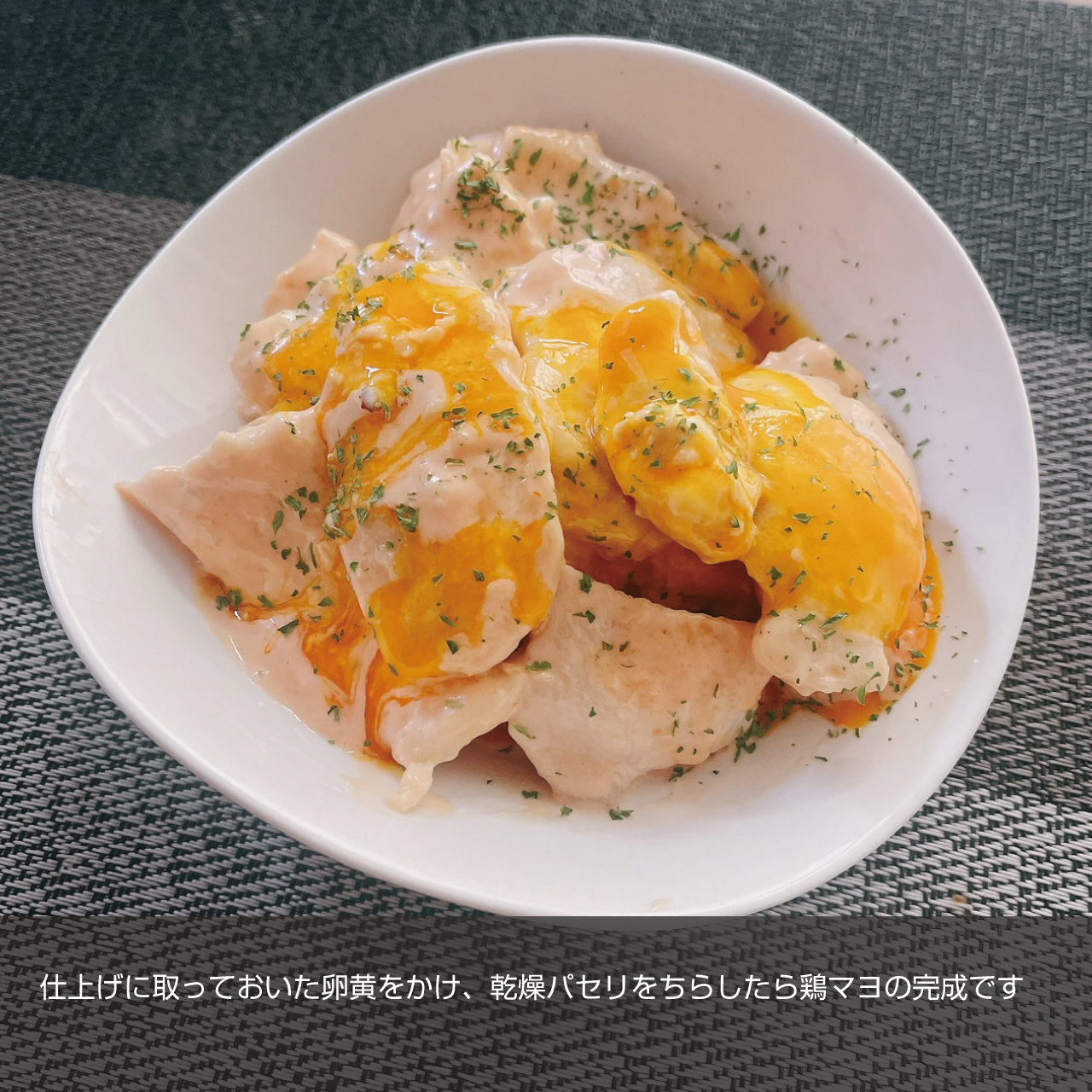 ⑧盛り付け。お皿に盛り付け残していた卵黄を後がけにし、パセリを全体に振ったら完成です。