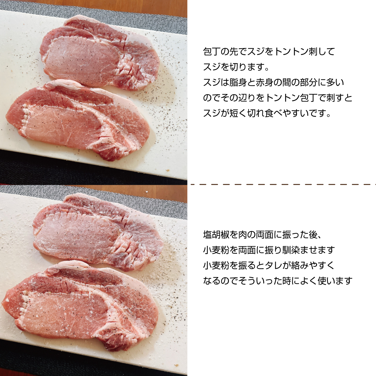 ③塩胡椒を肉の両面に振った後、小麦粉を両面に振り馴染ませます(小麦粉を振るとタレが絡みやすくなります)
