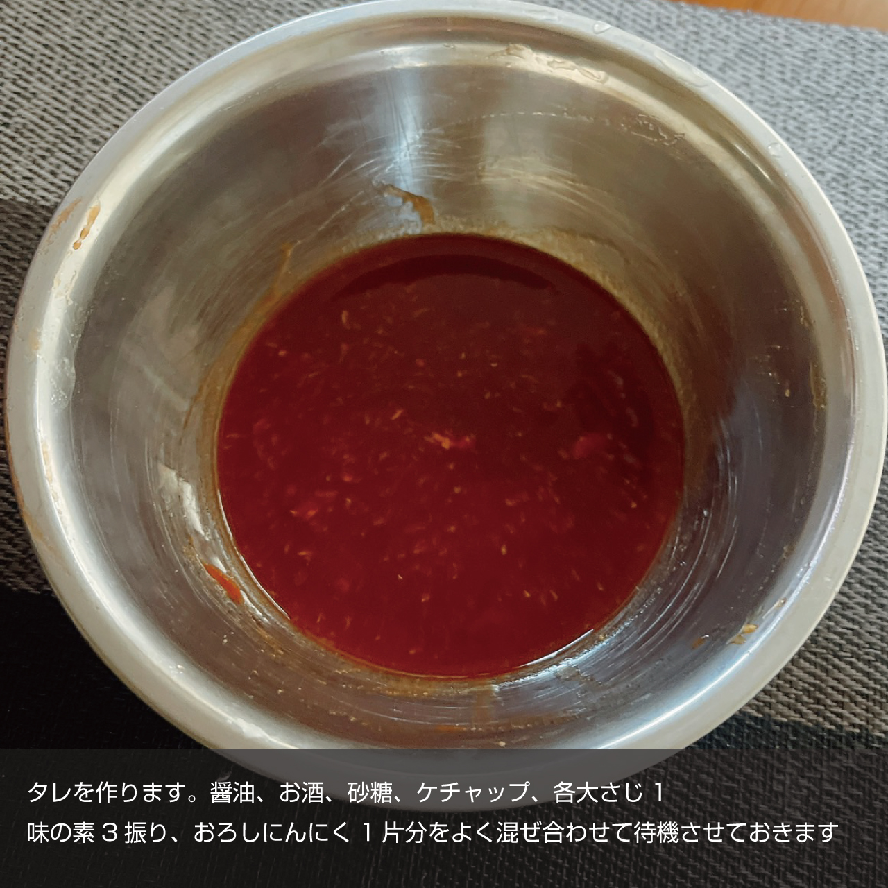 ④タレを作ります。醤油、お酒、砂糖、ケチャップ、各大さじ1と味の素3振り、おろしにんにく1片分をよく混ぜ合わせます。