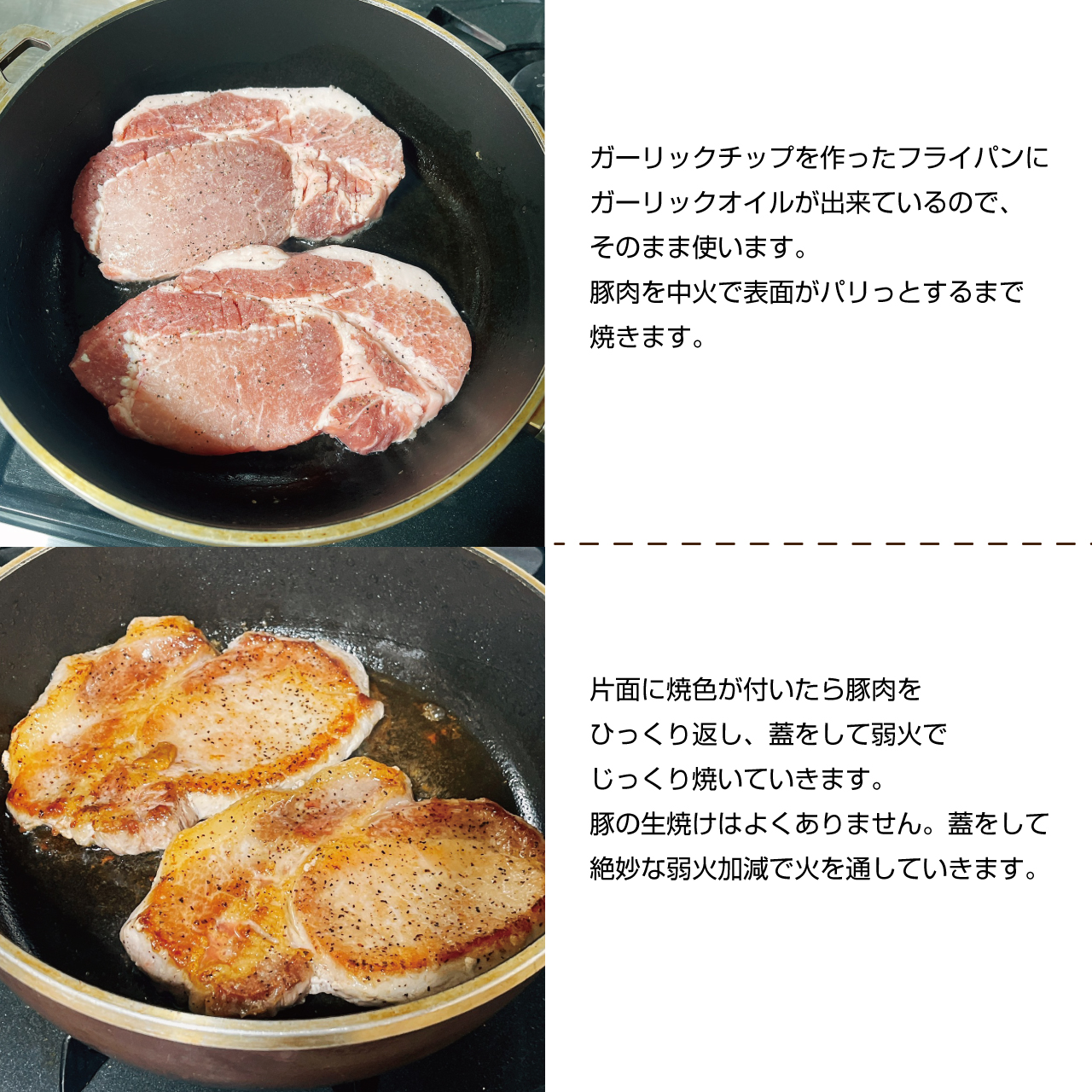 ⑦ ⑥のガーリックオイルが入ったフライパンをそのまま使います。豚肉を中火で表面がパリっとするまで焼きます。