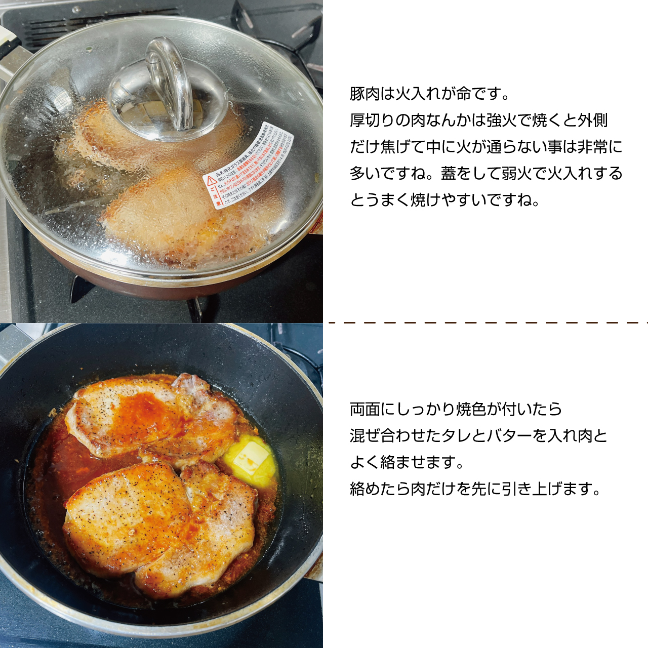 片面に焼色が付いたら豚肉をひっくり返し蓋をして弱火でじっくり焼きます。