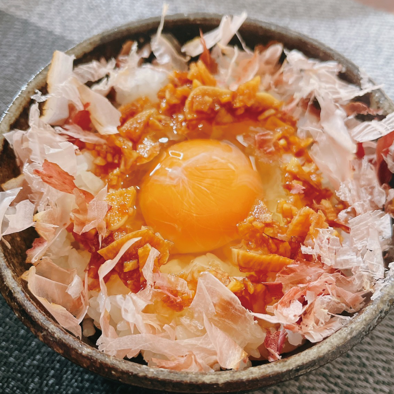 ⑤1枚目、2枚目の写真は卵かけご飯ですが、ご飯の上に、漬けにんにく、生卵、かつを節を入れました。これだけでめちゃくちゃ美味いです。ぜひお試しください。