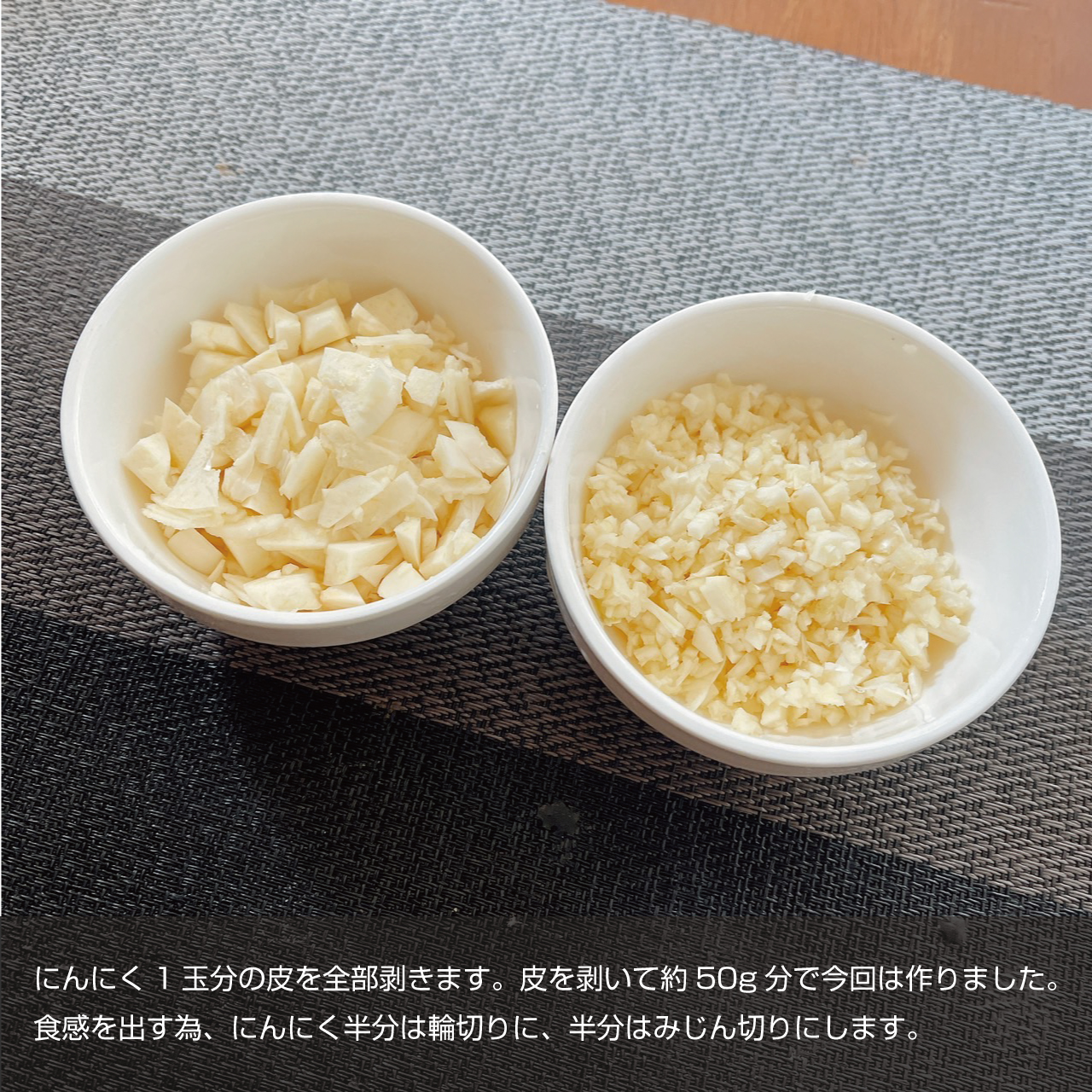 ②食感を出す為に、にんにく半分は輪切りに、半分はみじん切りにします。
