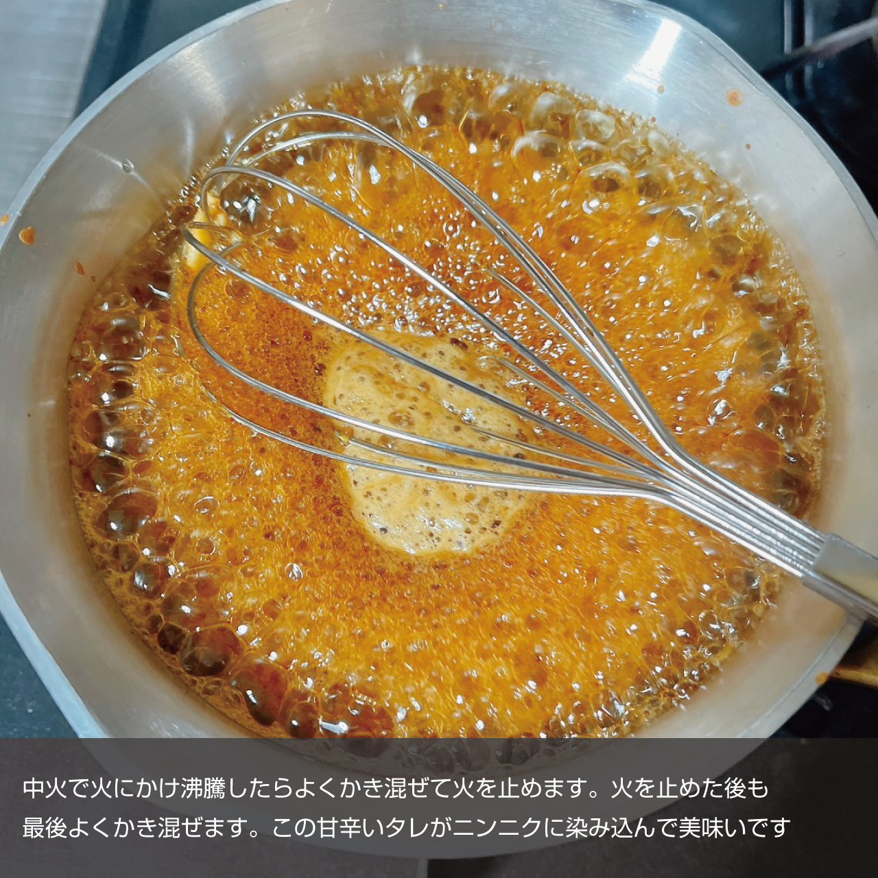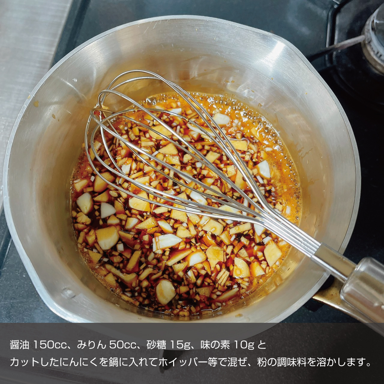 ③醤油150cc、みりん50cc、砂糖15g、うま味調味料10gとカットしたにんにくを鍋に入れてホイッパー等で混ぜ粉の調味料を溶かします。中火で火にかけ沸騰したらまたよく混ぜて火を止めます。