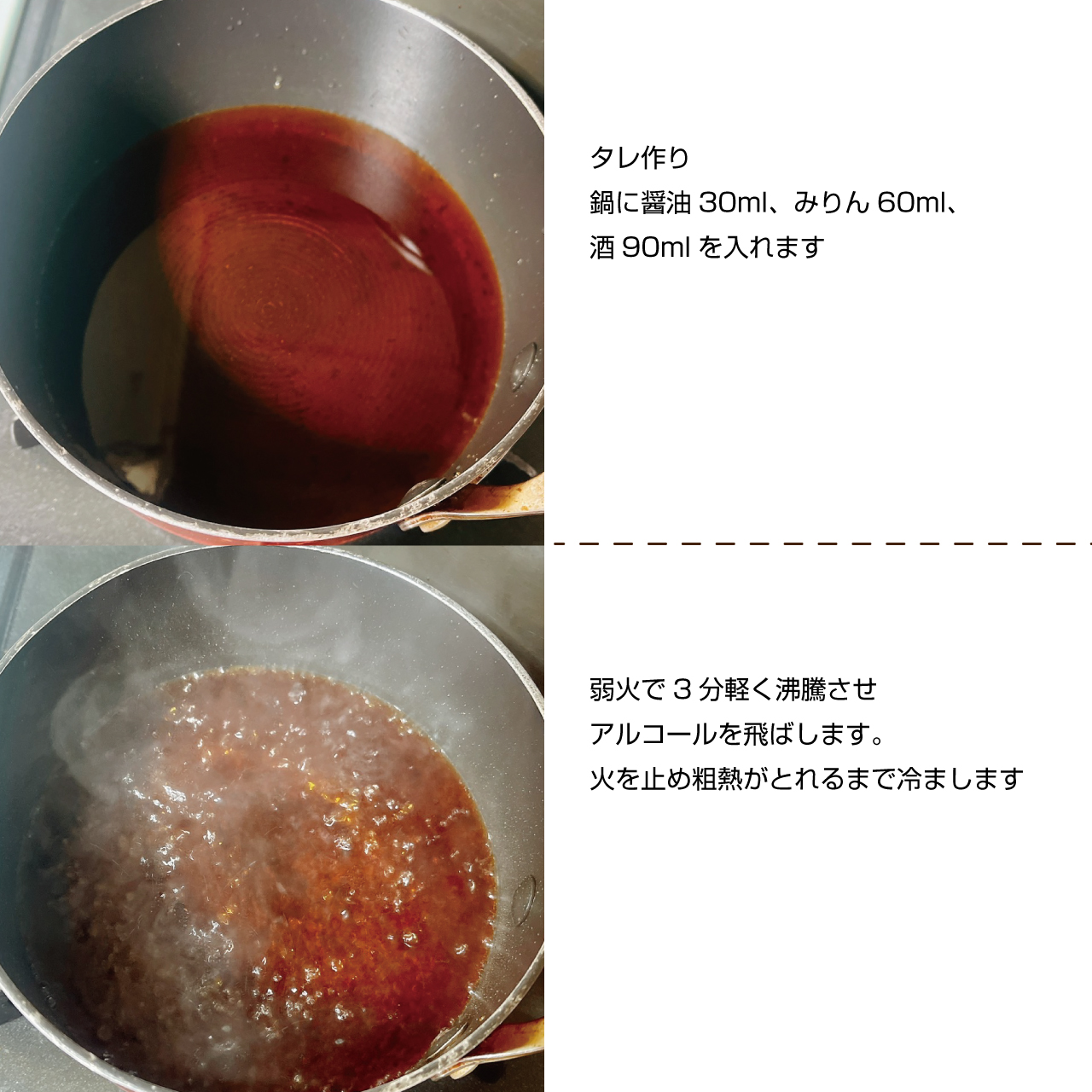 ①タレ作り 鍋に醤油30ml、みりん60ml、酒90mlを入れ弱火で3分軽く沸騰させアルコールを飛ばし、火を止め粗熱がとれるまで冷まします。