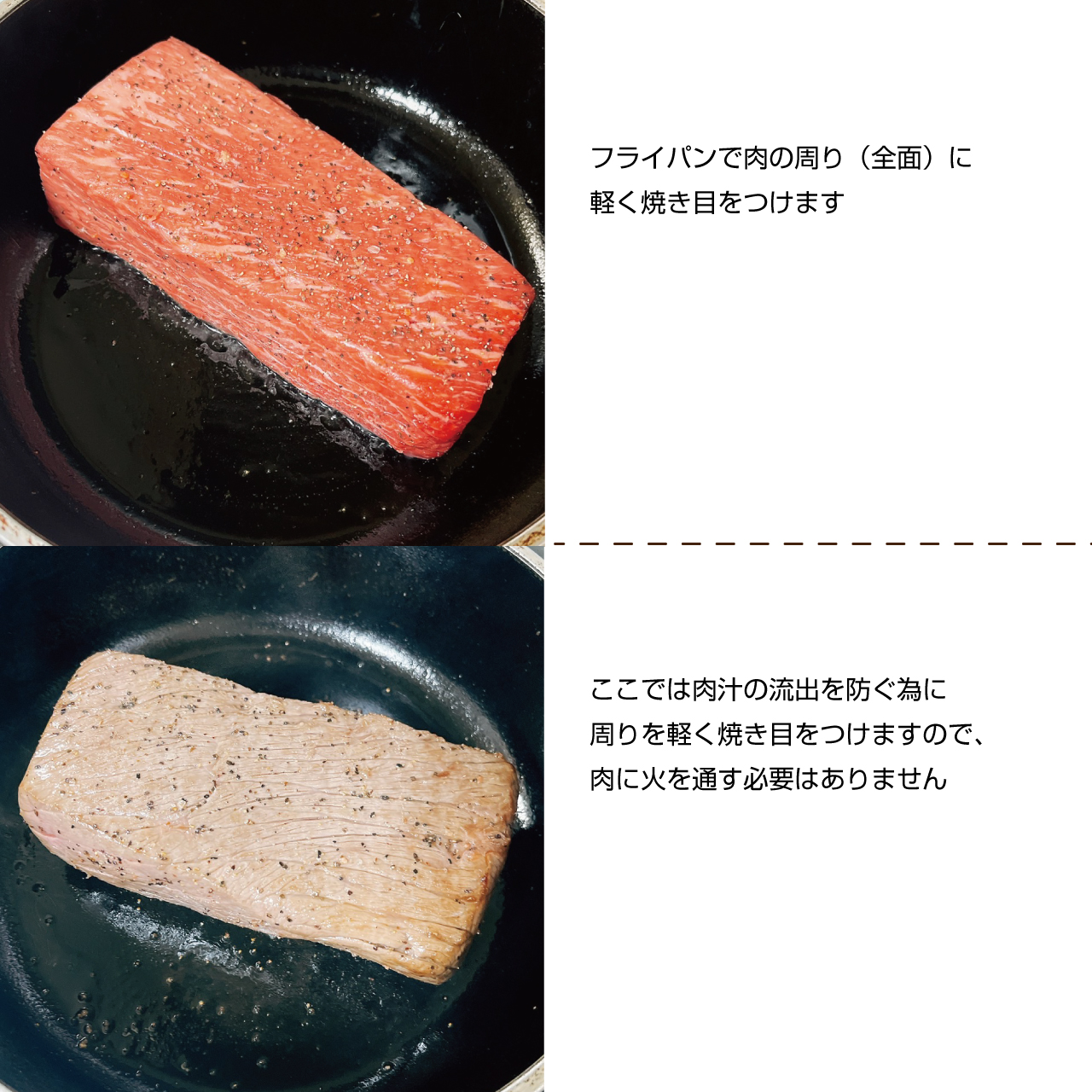②肉処理 肉に塩、胡椒を振りフライパンで肉の周り(全面)に軽く焼き目をつけます。ここでは肉汁の流出を防ぐ為に周りを軽く焼き目をつけます