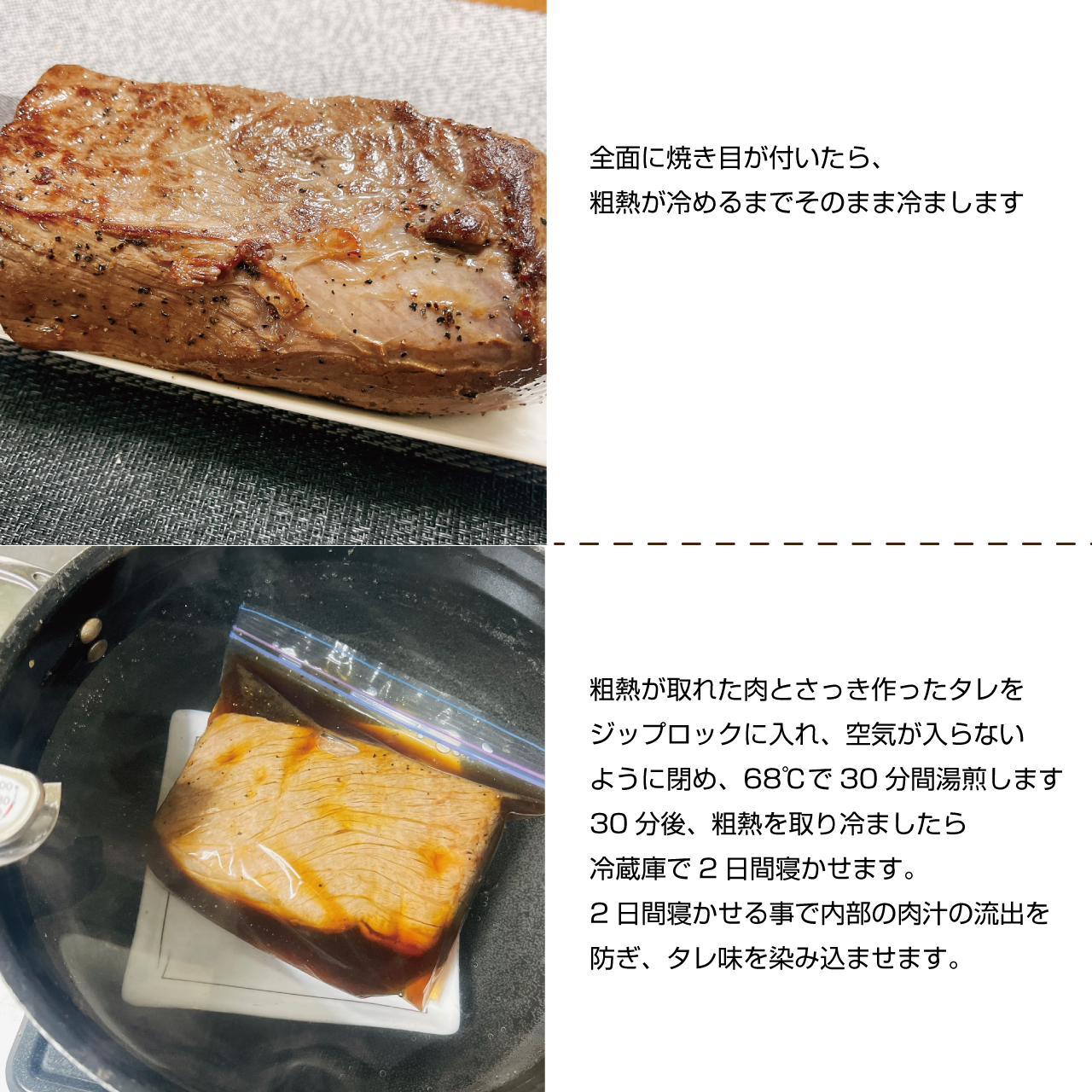 ③ ②の肉を冷ましてから、ジップロックに入れ①のタレを入れて空気が入らない状態を作ります。