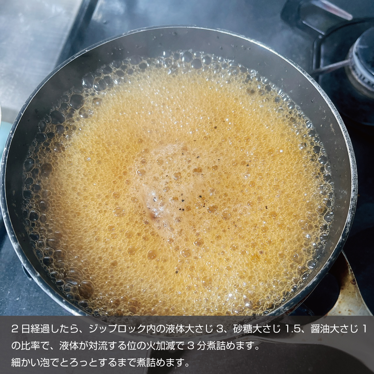 ⑤2日経過したら、ジップロック内の液体大さじ3、砂糖大さじ1.5、醤油大さじ1の比率で、液体が対流する位の火加減で3分煮詰めます。細かい泡でとろっとするまで煮詰めます。