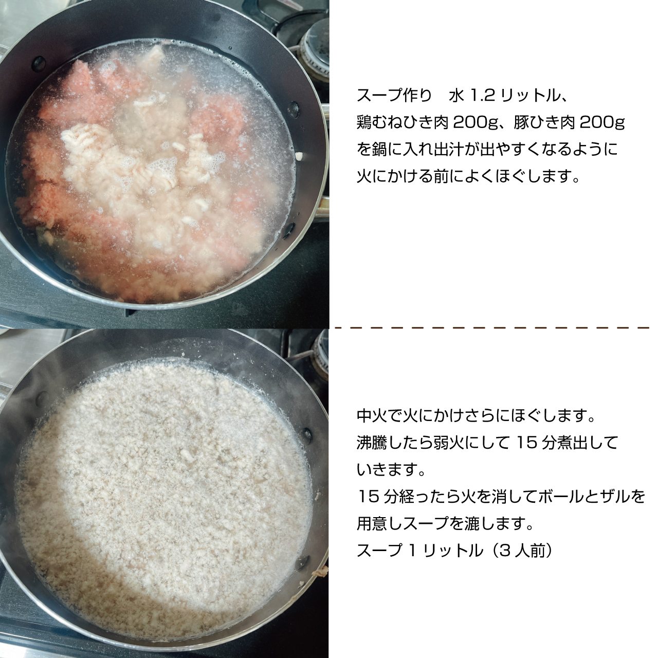 ①スープ作り 水1.2リットル、鶏むねひき肉200g、豚ひき肉200gを鍋に入れ出汁が出やすくなるように火にかける前によくほぐします。