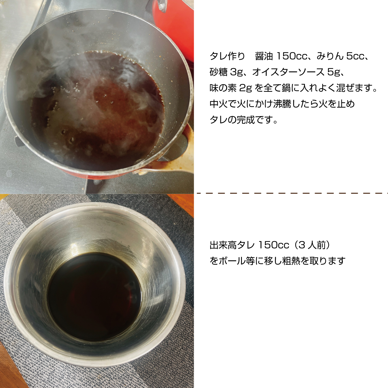 ③タレ作り 醤油150cc、みりん5cc、砂糖3g、オイスターソース5g、味の素2gを全て鍋に入れよく混ぜます。中火で火にかけ沸騰したら火を止めタレの完成です。タレ150cc(3人前)