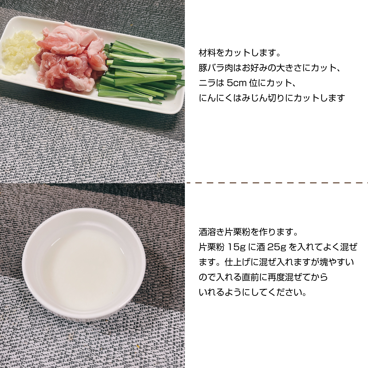 ④材料をカットします。豚バラ肉はお好みの大きさにカット、ニラは5cm位にカット、にんにくはみじん切りに、