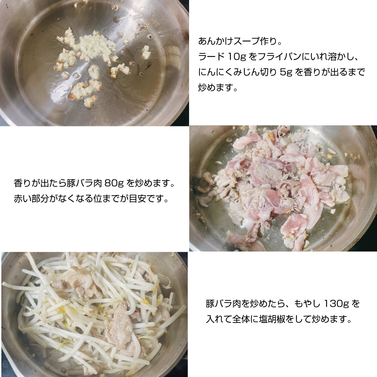 ⑥あんかけスープ作り。ラード10gをフライパンにいれ溶かし、にんにくみじん切り5gを香りが出るまで炒めます。香りが出たら豚バラ肉80gを炒めます。