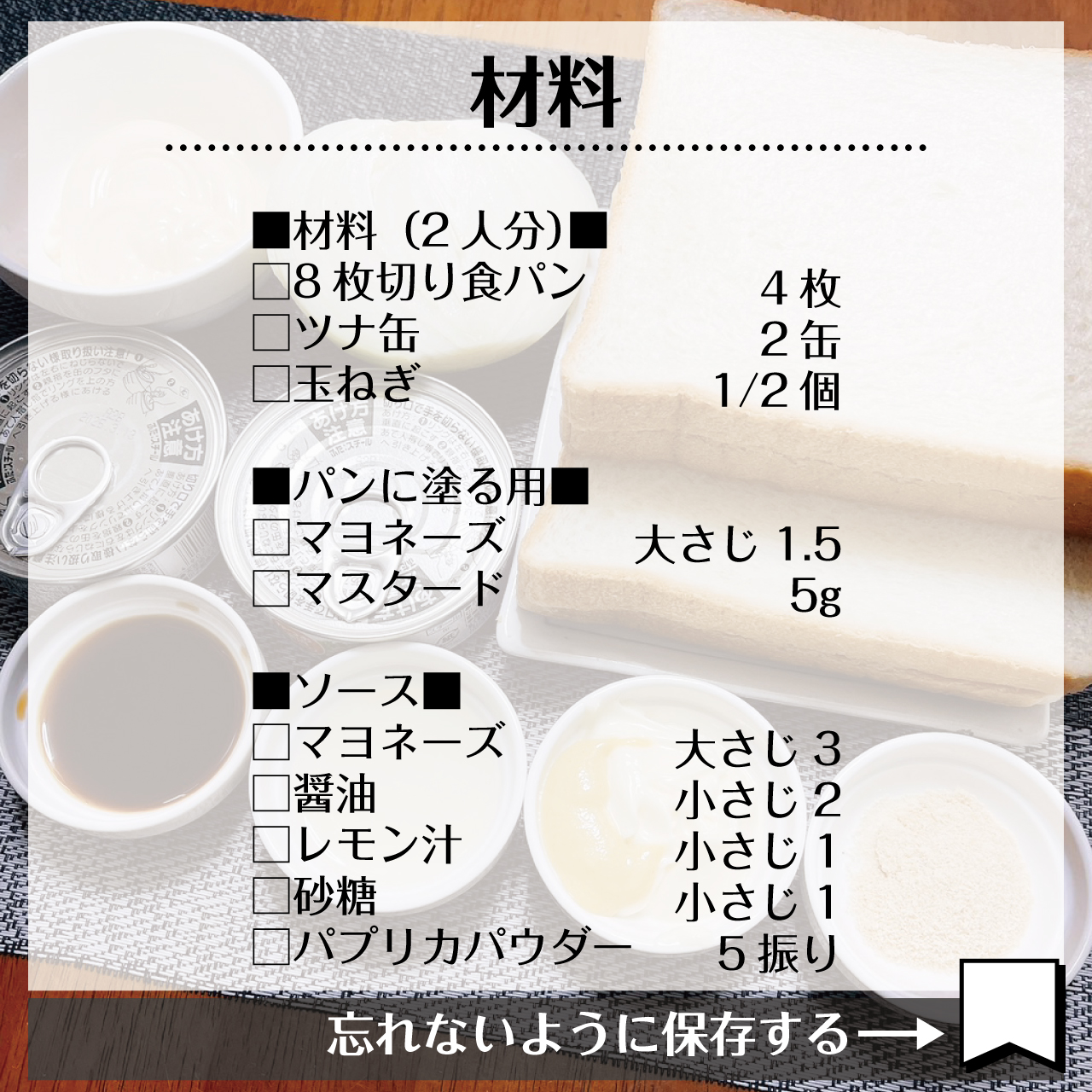 今回はサンドイッチの定番のツナサンドです。