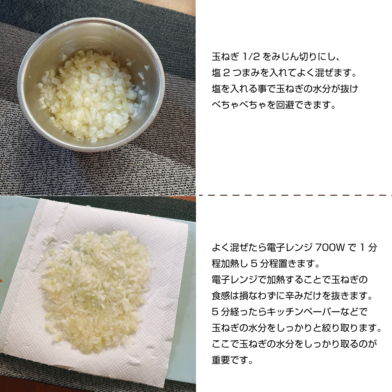 ①玉ねぎの水分をしっかり絞る