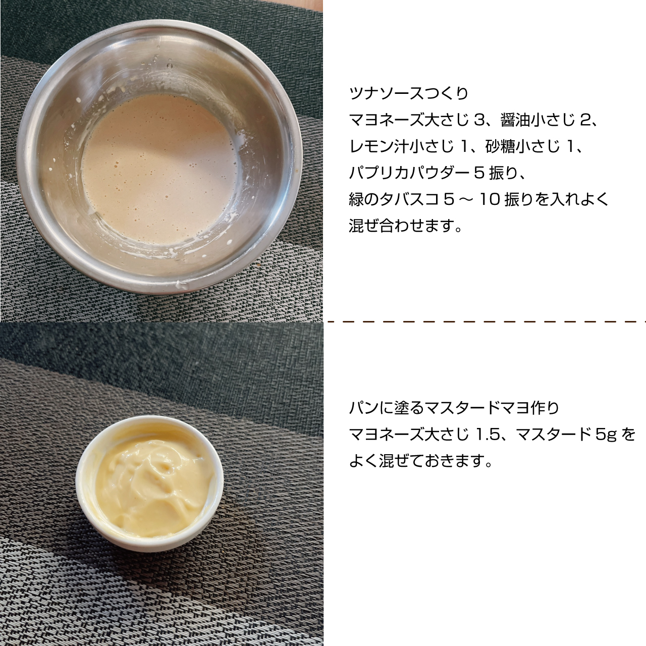 ②パンに塗るマスタードマヨ作り マヨネーズ大さじ1.5、マスタード5gをよく混ぜておきます。
