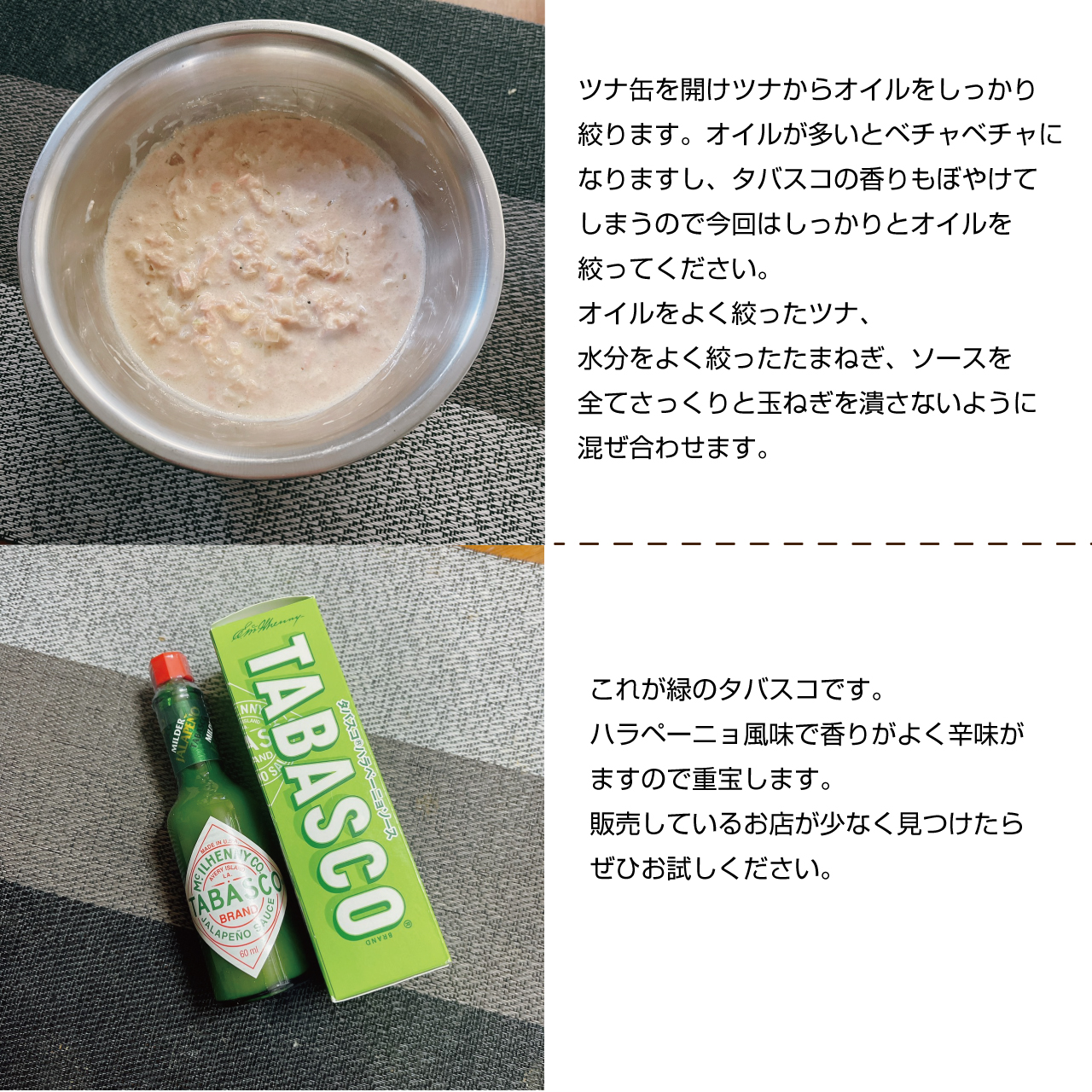 ④ツナ缶を開けツナからオイルをしっかり絞ります。オイルが多いとベチャベチャになりますし、タバスコの香りもぼやけてしまうので今回はしっかりとオイルを絞ってください。オイルをよく絞ったツナ、水分をよく絞った①のたまねぎ、③のソースを全てさっくりと玉ねぎを潰さないように混ぜ合わせます。