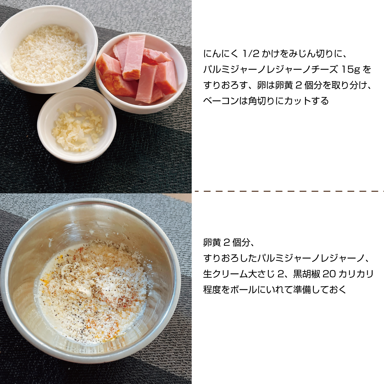 ①にんにく1/2かけをみじん切りに、パルミジャーノレジャーノ15gをすりおろす、卵は卵黄2個分を取り分ける、ベーコンは角切りに