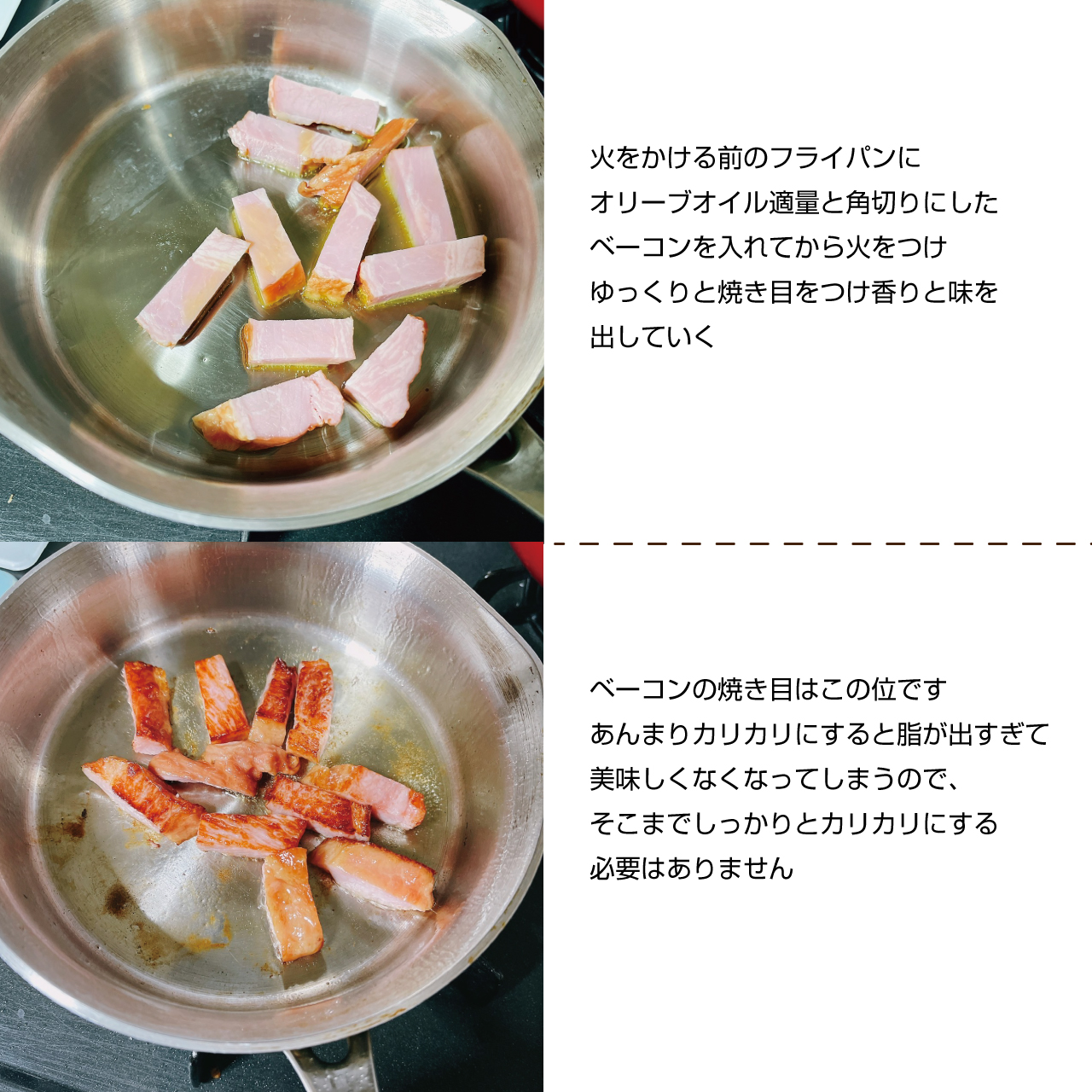 ③火をかける前のフライパンにオリーブオイル適量と角切りにしたベーコンを入れてから火をつける。ゆっくりと焼き目をつけ香りと味を出します。