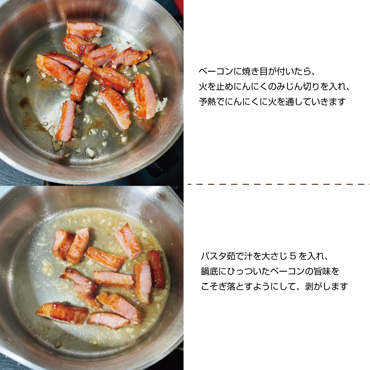 ④ベーコンに焼き目が付いたら、火を止めにんにくのみじん切りを入れ、予熱でにんにくに火を通していきます
